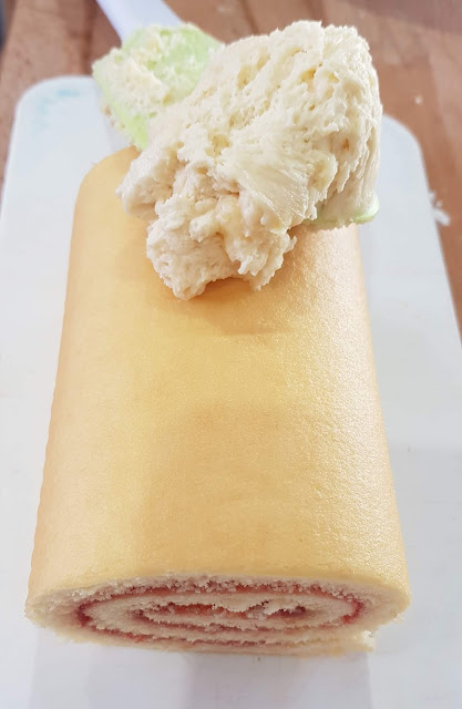 I then cut a jam sponge roll to size for the neck and face, we built the face up a bit to make it rounder and give it a snout. I covered them in frosting and placed them on top of the cake.