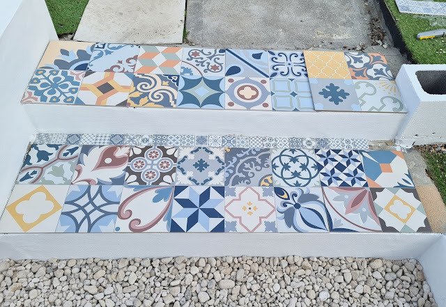 11th October 2021, I spotted this tile in Bunnings and fell in love, I thought it would look fantastic on the garden steps leading from the pavers, they were $69 for a pack of 12, we thought they would be all the same pattern but was pleasantly surprised to find that all 12 tiles had different patterns.