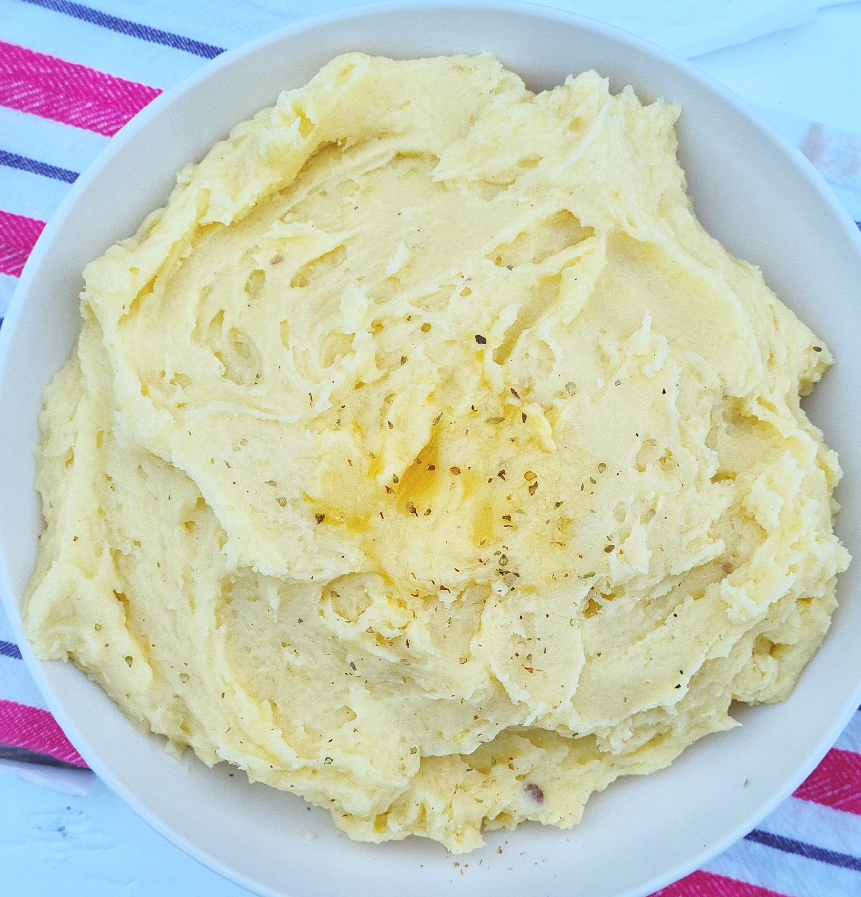 I give them a quick rough mash with the hand masher just to break the potatoes up a bit then whip them in the stand mixer adding warm milk and a little butter to give them the smooth creamy taste and texture I adore.